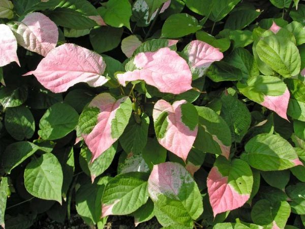 ACTINIDIA KOLOMIKTA – je liana s výhonkami dlhými 4-6 m, má pestro sfarbené listy, ktoré sú na začiatku krémovo žlté a neskôr sa menia na karmínovo červené. Je dvojdomé a jej oválne plody sú zelenožltej farby, veľké asi 2,5cm a dozrievajú v auguste.